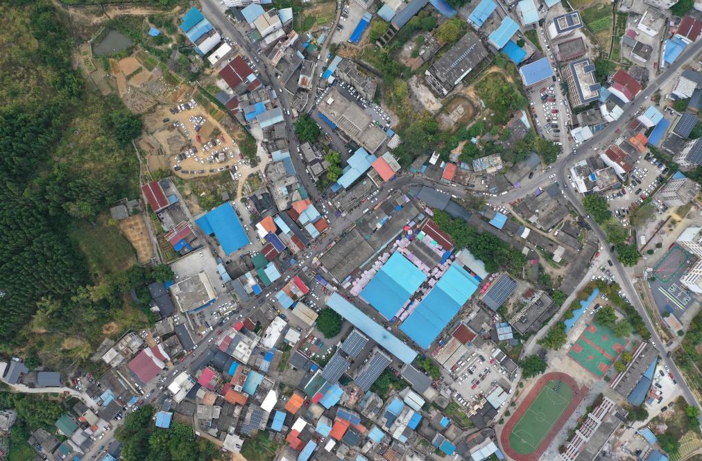 柳州市柳江區成團鎮農貿市場周邊停滿了早市食客的汽車(無人機照片,11月20日攝)。