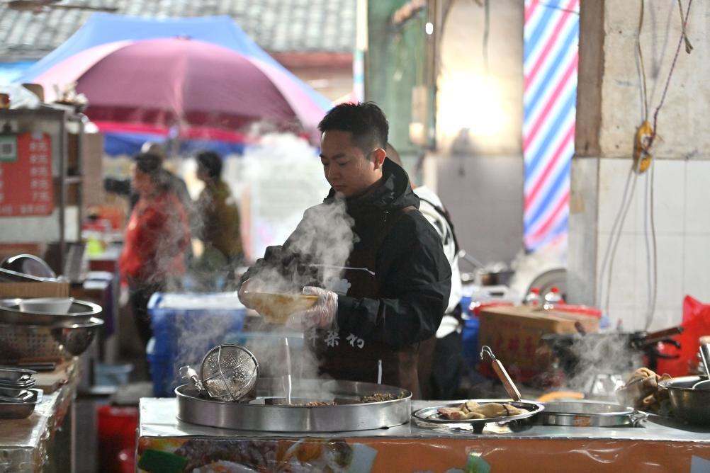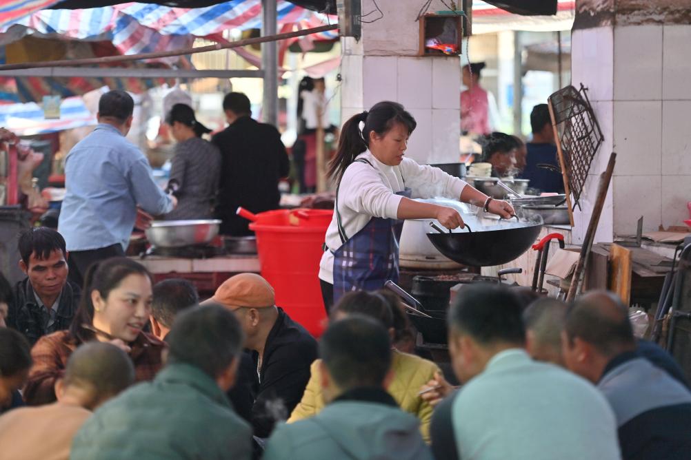 廣西柳州市柳江區成團鎮農貿市場的早市早餐有數十年歷史,因價格實惠、味道鮮美,深受十里八村人們喜愛。