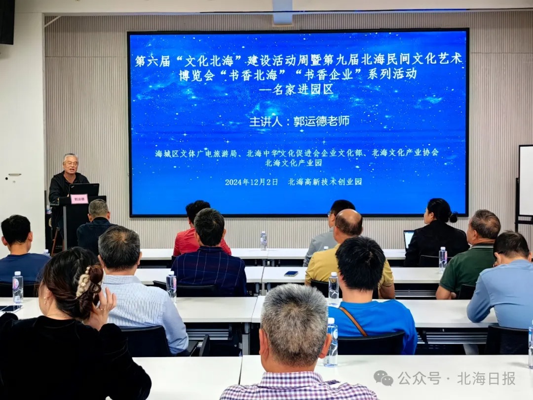 12月2日下午,“書香北海”“書香企業”——名家走進北海高新技術創業園活動舉行,中國文聯原副主席、“文化北海”建設高級顧問郭運德授課,來自園區的約40名企業負責人參加了活動。