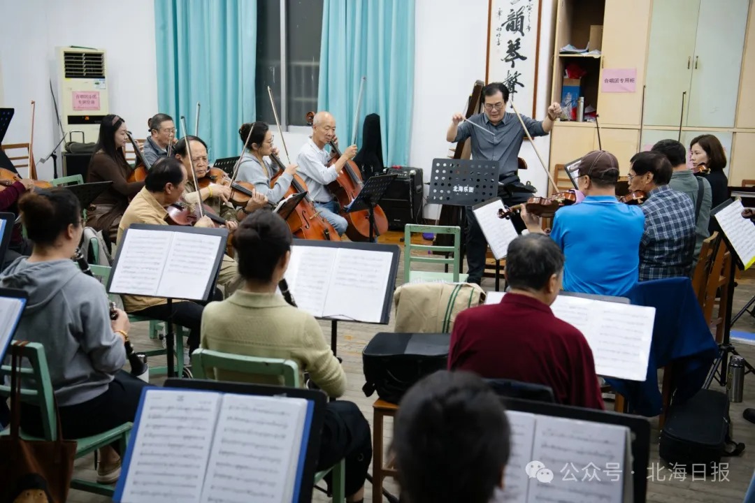 125日晚,市婦女兒童活動中心的大教室裏傳出氣勢恢宏的交響樂曲,北海樂團正在進行交響音詩《走進北海的故事裏》排練。樂團指揮蔣志毅不時停下來,跟大家講解弦樂的聲部、舒緩與力度。四十多名演奏者按照指揮的要求反復進行調整改進。