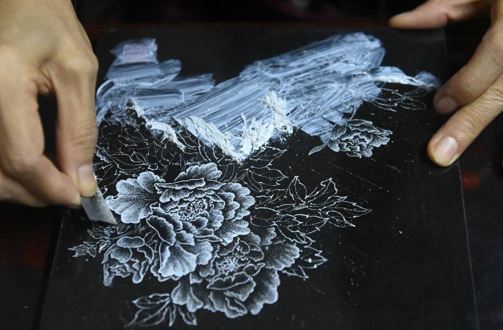 劉雪山在石頭上“作畫”運用的是劉記石雕製作技藝,是南寧市級非物質文化遺産代表性項目,其製作過程主要是採用花崗岩等純色石材,經過水磨拋光後,在磨光面上把要雕琢的圖像輪廓描繪出來,根據黑白明暗成像原理,用鋼鑿、鋼鏨等工具,通過運用腕力調節針點疏密、粗細、深淺和虛實變化來呈現圖像,創作作品。