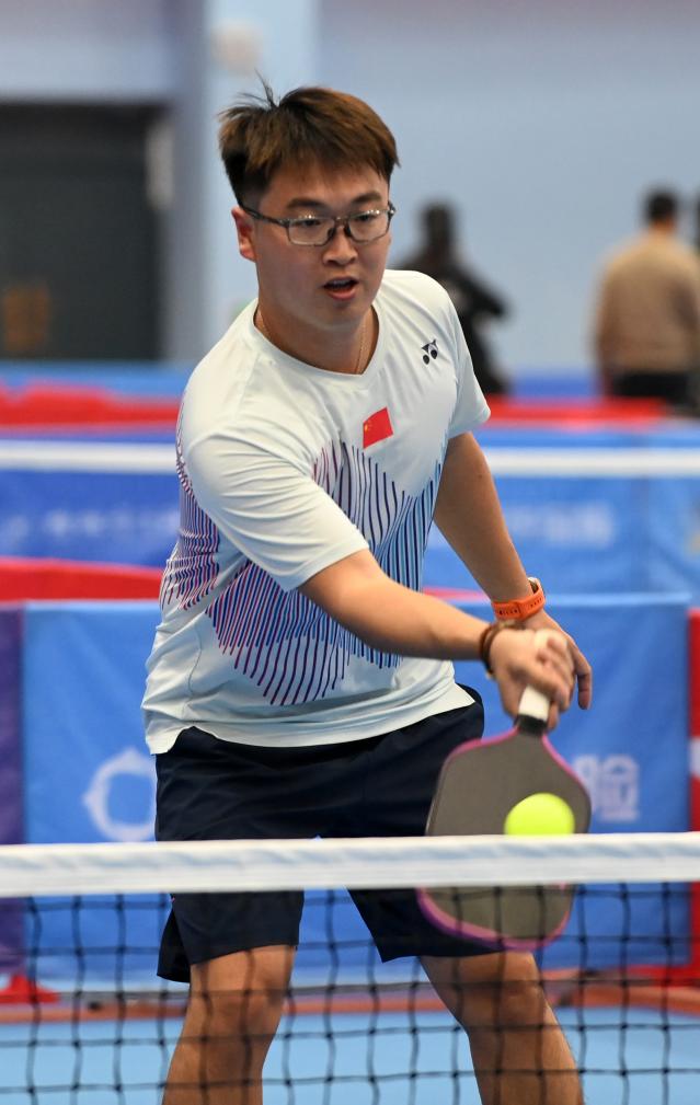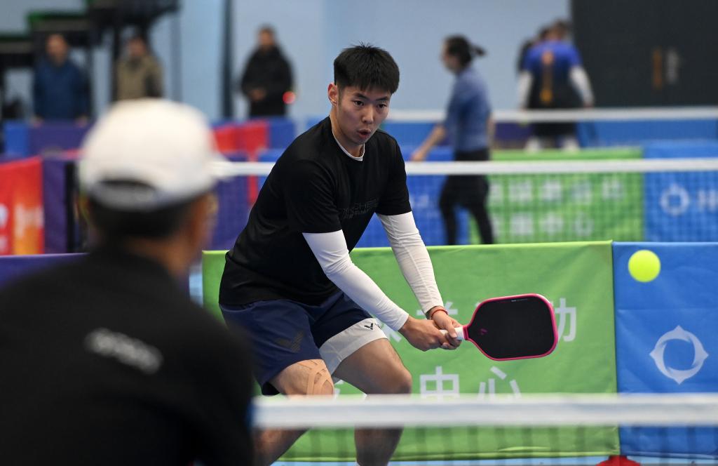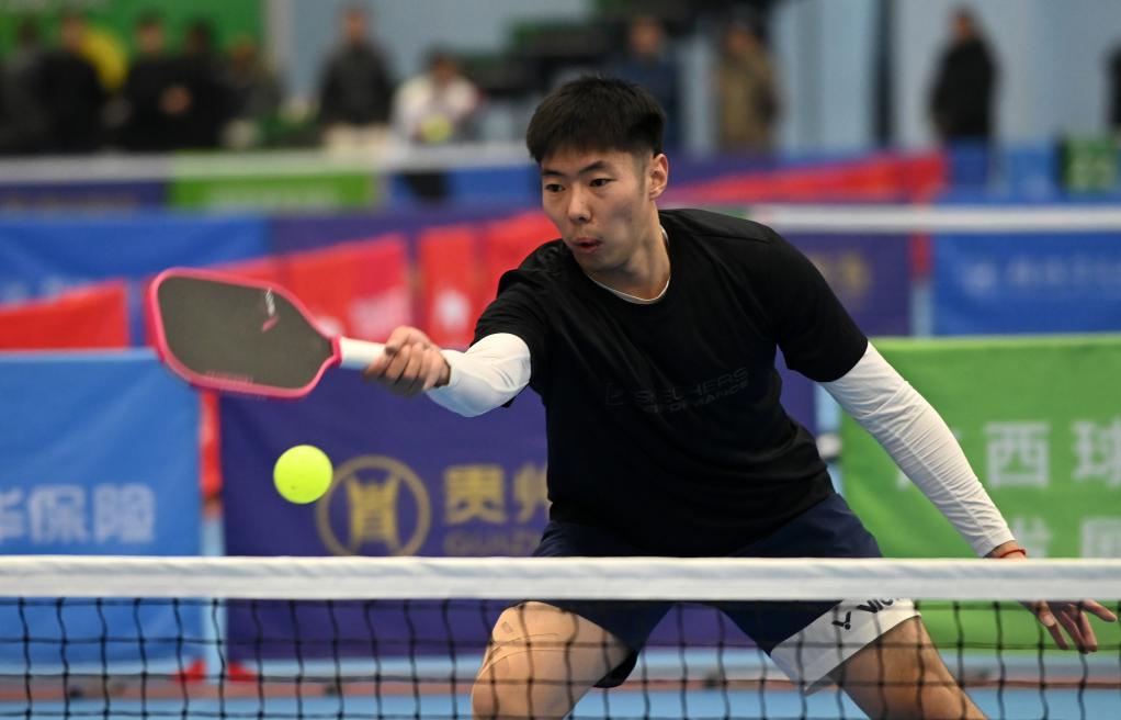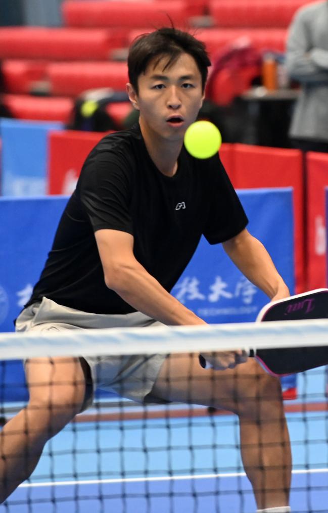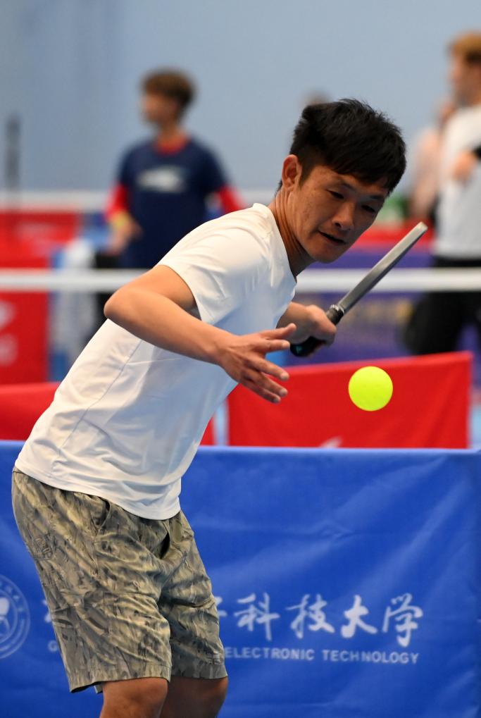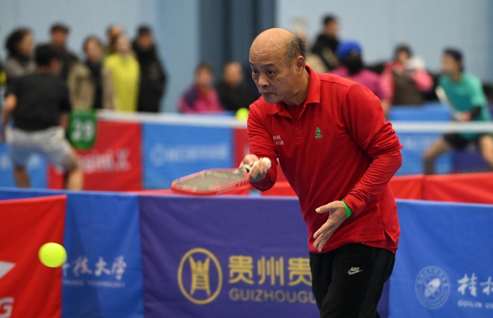 12月20日,在廣西桂林電子科技大學球類館,匹克球賽選手在比賽中。