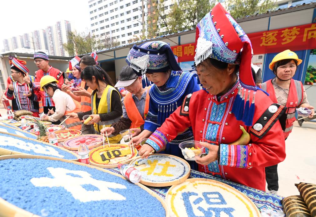來自吉林的游客朱琳琳第一次品嘗五色糯米飯,入口前就被鮮艷的色彩吸引了,她依次嘗了不同顏色,接着又將各色糯米飯拌勻。“怎樣都好吃!我們要跟村民買材料回到東北自己做來吃。”她説。