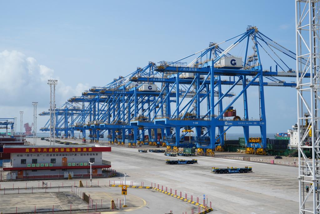 今年4月7日,搭載1500輛汽車的中國籍滾裝船“長髮隆”駛離欽州港,橫渡遠海,直達中東貿易樞紐迪拜傑貝阿里港,標誌着西部陸海新通道北部灣港滾裝船航線成功首航。