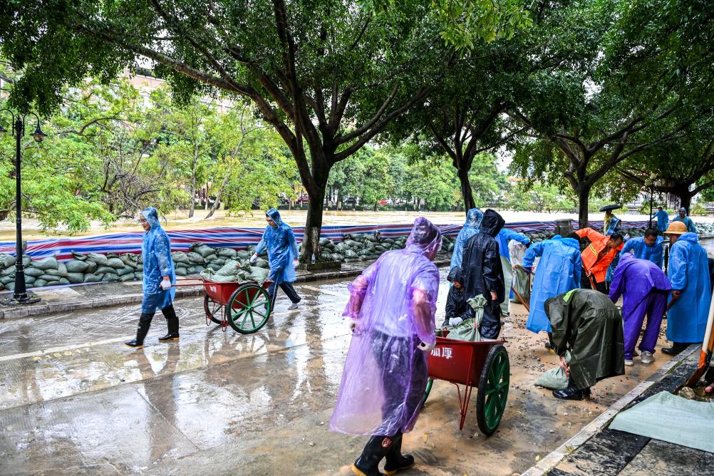 “現在鑒河河流水位還在上漲,水位高、流量大、流速快,對堤防的考驗很大。”德保縣城管局局長岑忠歐説,縣裏各部門組織近300人爭分奪秒地對薄弱堤段進行加固,全力確保城區安全。