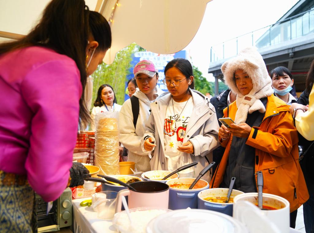 華燈初上,游客們被風雨橋上飄來的陣陣香氣吸引而來。泰國船面、馬來西亞蝦片、越南春卷……100多家中外餐飲企業帶着自家的拿手美食,亮相“筷意東南亞”2025年中國—東盟(南寧)美食文化匯活動。游客們在品嘗異域美食的同時,還能聽大廚們講述美食背後的文化故事。