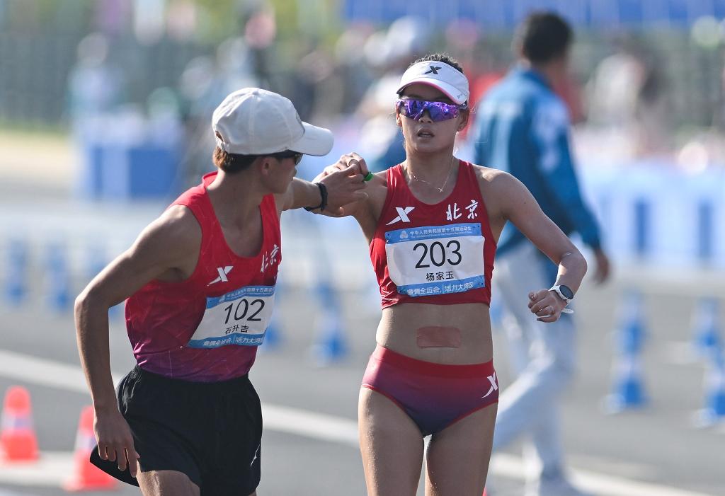 上午進行的馬拉松競走混合接力決賽中,由石升吉和楊家玉組成的北京隊以2小時58分01秒的成績奪冠。