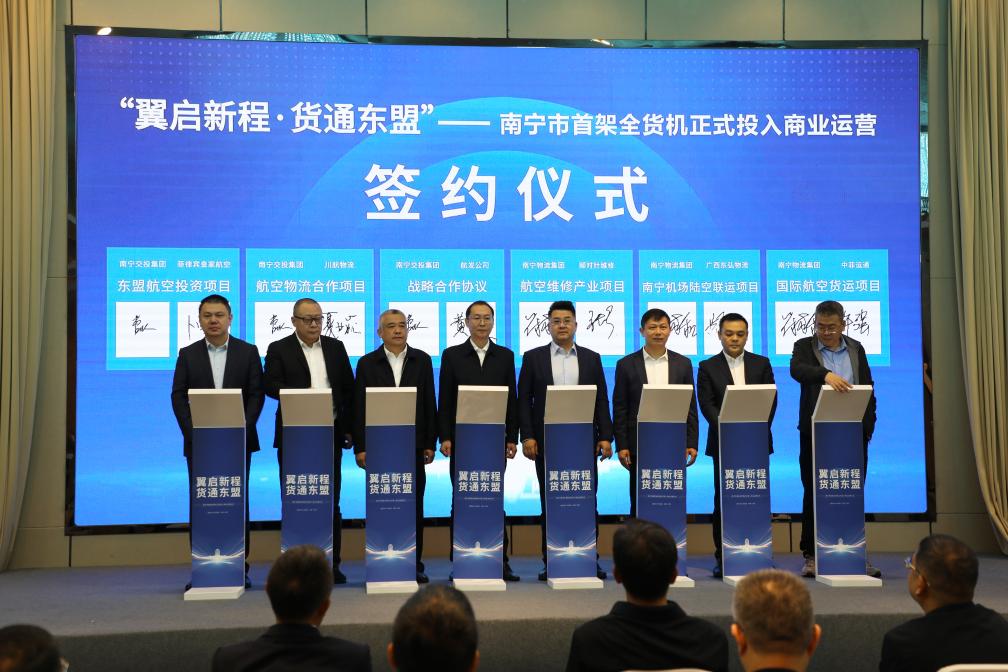 運營儀式現場,8家航空物流企業還共同簽署了戰略合作協議。各方計劃整合資源,“鏈”接各方在航線運營、商貿運輸、産業配套等方面的優勢,積極推進物流與貿易、加工、維修等航空産業融合發展,形成南寧市“運貿結合、以貿促工”的新格局。