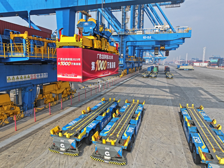 12月30日,北部灣港迎來又一里程碑式時刻:集裝箱年吞吐量突破1000萬標箱,集裝箱航線總數達100條;2025年西部陸海新通道鐵海聯運班列累計開行超萬列,北部灣港鐵海聯運集裝箱運量突破50萬標箱。
