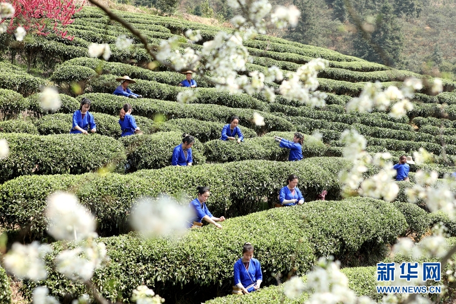 春分將至,在廣西柳州市三江侗族自治縣八江鎮歸令村六更屯,千余株梨樹、李樹、桃樹迎春綻放,深山茶園嫩芽勃發,茶農們搶抓時節,在盛開的花海裏忙採春茶。