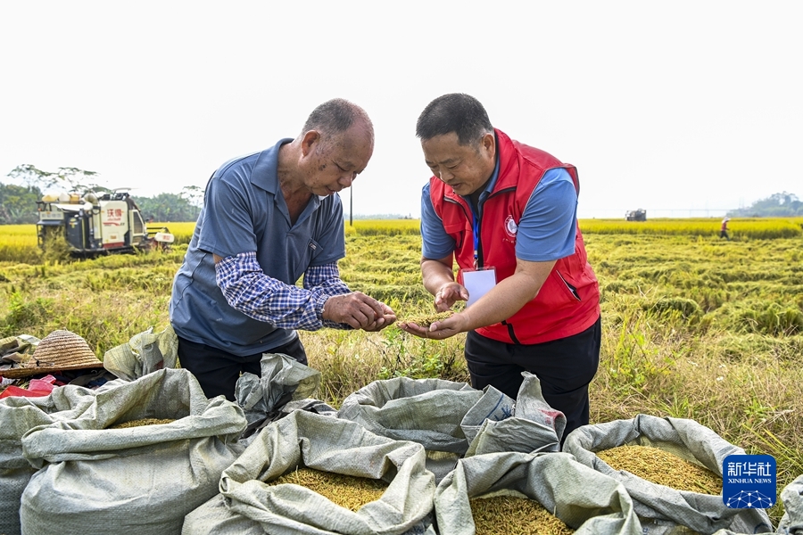 11月10日,在興業縣石南鎮鳳山村的稻田裏,科技特派員(右)在查看晚稻品質。