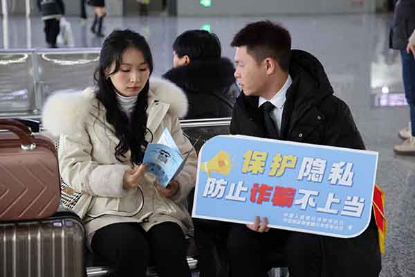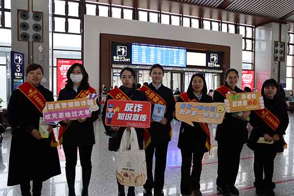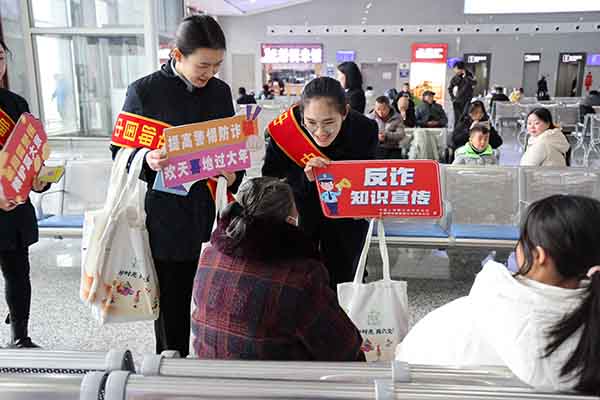 在畢節市高鐵站二樓候車室,郵儲銀行畢節市分行工作人員向候車乘客發放反詐宣傳小冊子、講解反詐知識,並邀約乘客參與反詐知識搶答。同時,候車室語音滾動播報郵儲銀行溫馨提示,檢票口兩旁也分別放置一台電視機,循環滾動播放“全民反詐,我們在行動”“平安春運,謹防詐騙”等反詐相關知識內容,工作人員手持各種醒目的“謹防詐騙” 提示牌,提醒乘客注意防範6種常見的電信詐騙種類。