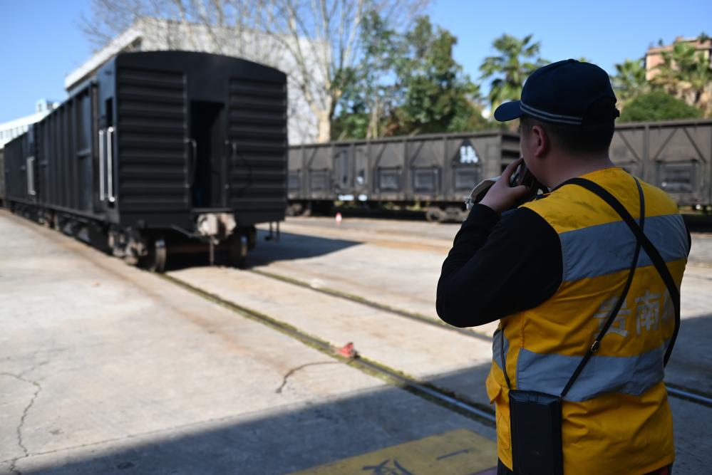 2月18日,在貴陽南車輛段檢修車間,一名工作人員指揮已維修好的車輛出庫。