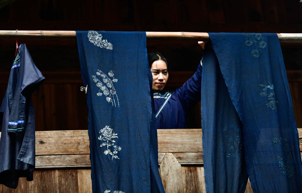 3月18日,貴州省榕江縣栽麻鎮大利侗寨的村民在晾曬侗布。