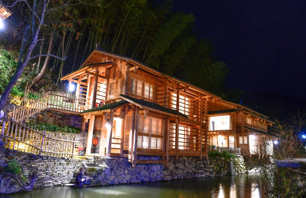 這是3月17日拍攝的貴州省榕江縣栽麻鎮大利侗寨月亮山居民宿夜景。