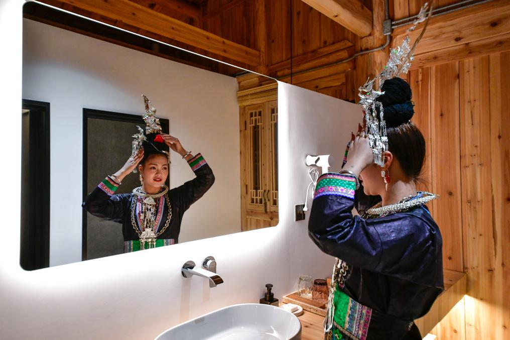 3月17日,村民在貴州省榕江縣栽麻鎮大利侗寨月亮山居民宿裏整理銀飾。