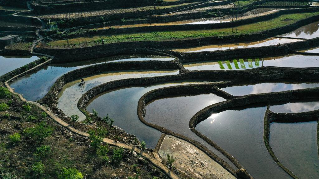這是畢節市七星關區生機鎮高流村使用絕壁天渠灌溉的稻田(2024年4月24日攝)。 絕壁天渠如今依然發揮着灌溉作用