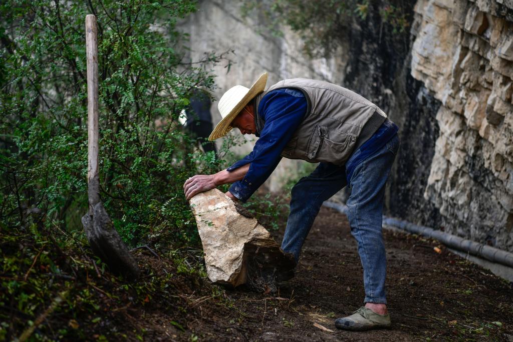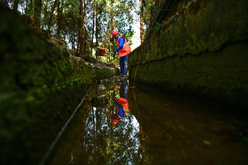 護渠隊員在畢節市七星關區生機鎮清理高流天渠旁的落葉與碎石,防止這些雜物堵塞溝渠(2024年4月24日攝)。 衛星天渠的成功修建