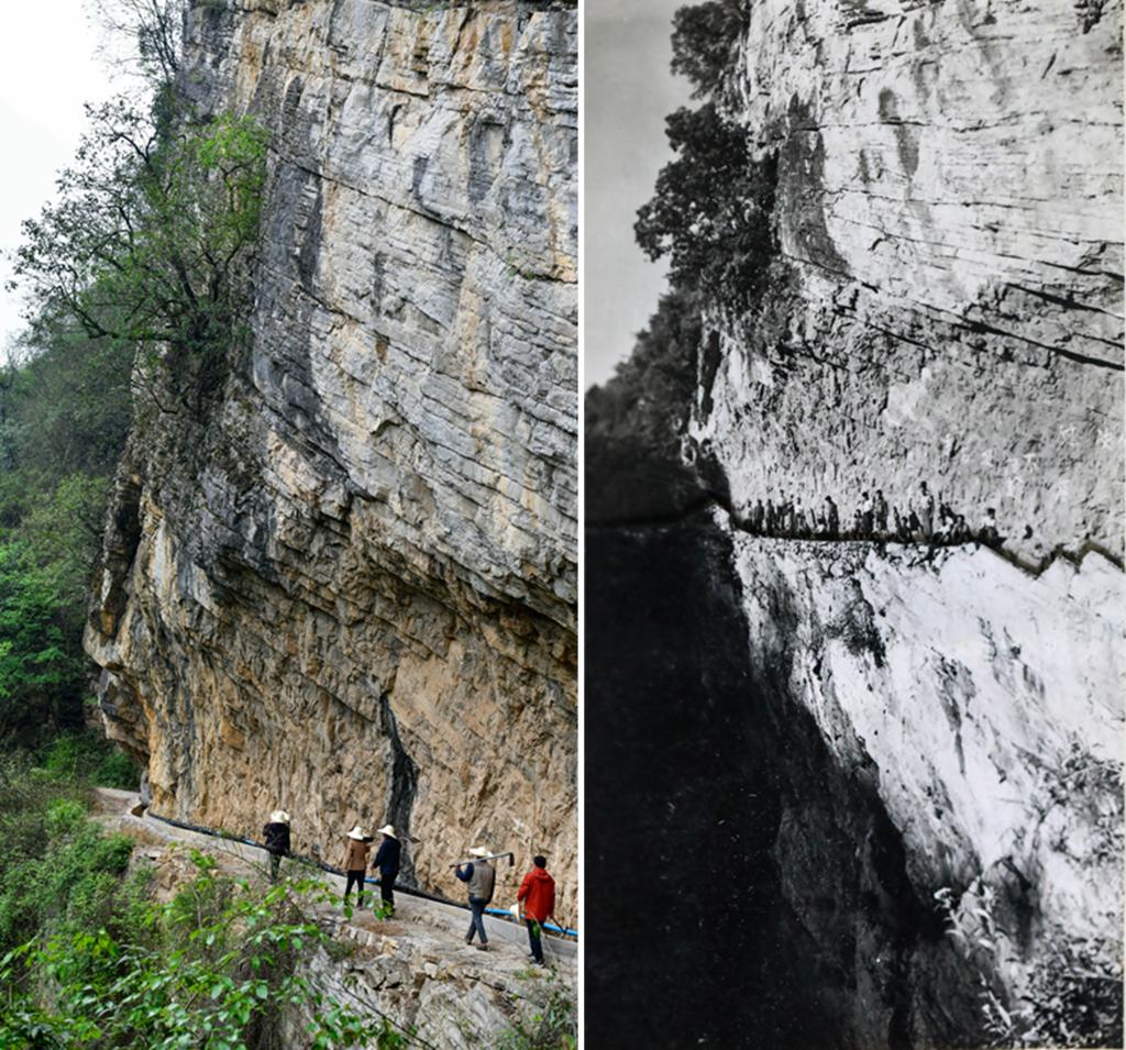 上圖為2024年4月24日,護渠隊員在畢節市七星關區生機鎮巡護高流天渠時留影;下圖為1960年,村民在七星關區生機鎮修鑿絕壁天渠時的合影。