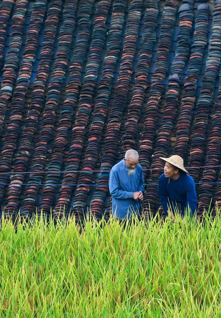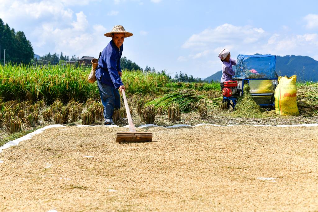 楊正熙(左)在貴州省黎平縣尚重鎮洋洞村的梯田上幫助村民晾曬稻穀(9月19日攝)。