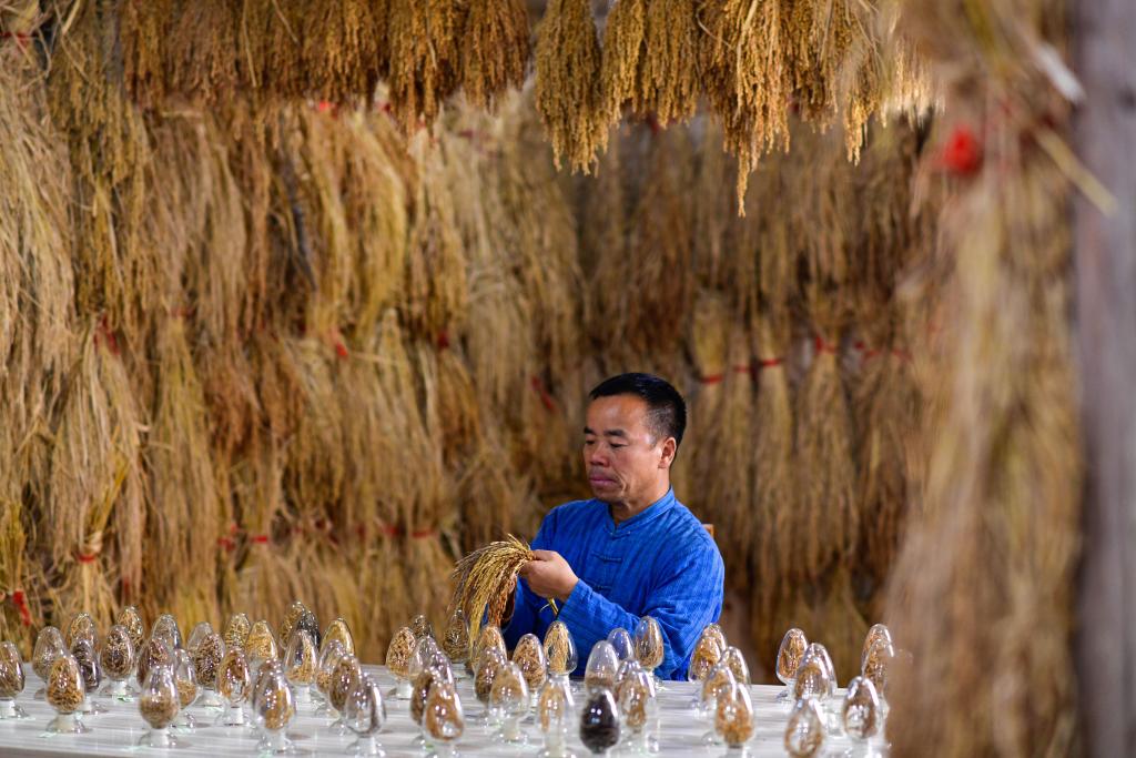 楊正熙在貴州省黎平縣尚重鎮洋洞村的種子博物館裏整理水稻老品種(5月18日攝)。