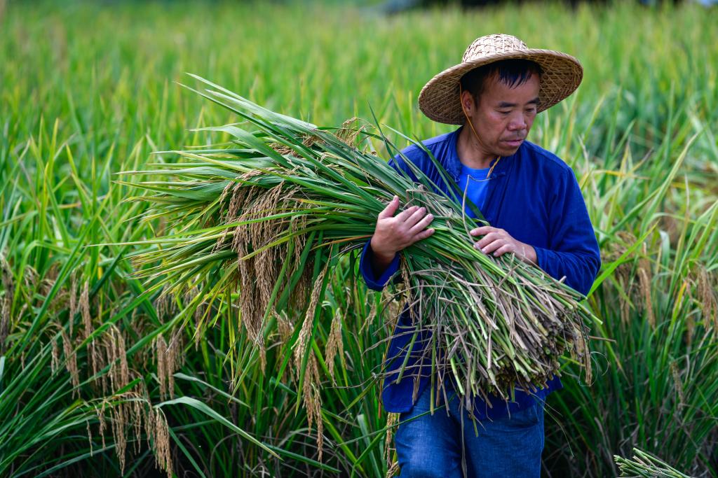楊正熙在貴州省黎平縣尚重鎮洋洞村的梯田裏幫助村民收割水稻(9月19日攝)。