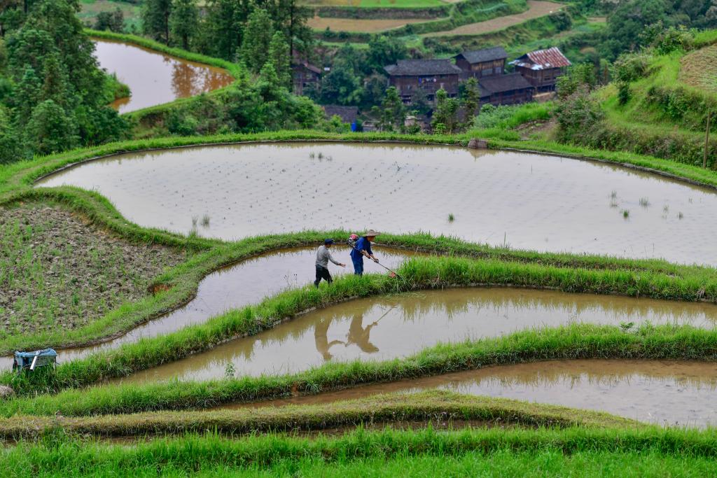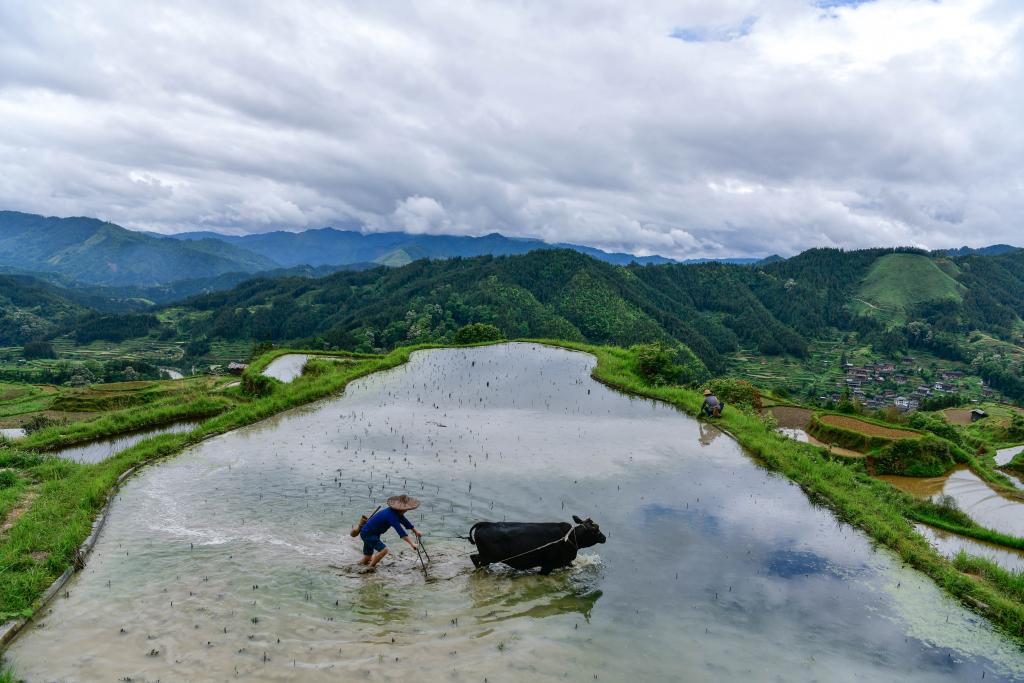 楊正熙在貴州省黎平縣尚重鎮洋洞村的梯田上幫助村民耕田(5月19日攝)。