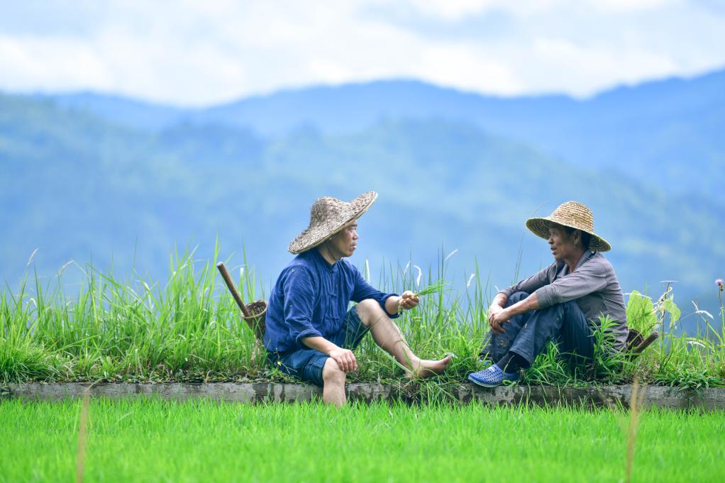 在貴州省黎平縣尚重鎮洋洞村,楊正熙(右)幫助村民在田埂上割草(5月19日攝)。