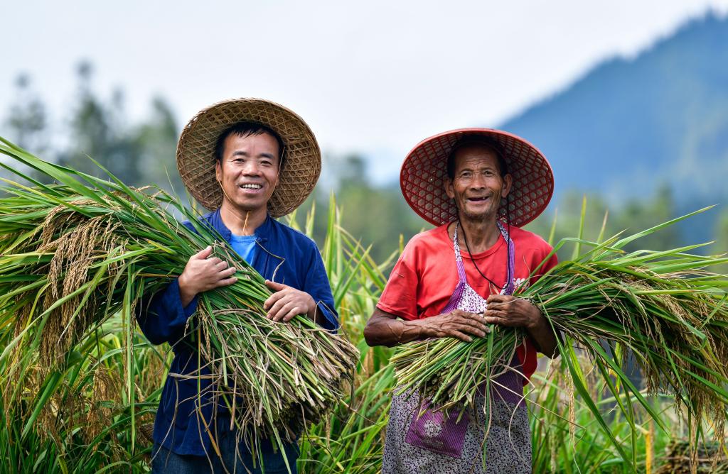 在貴州省黎平縣尚重鎮洋洞村,楊正熙(左)與村民展示收割的有機稻(9月19日攝)。