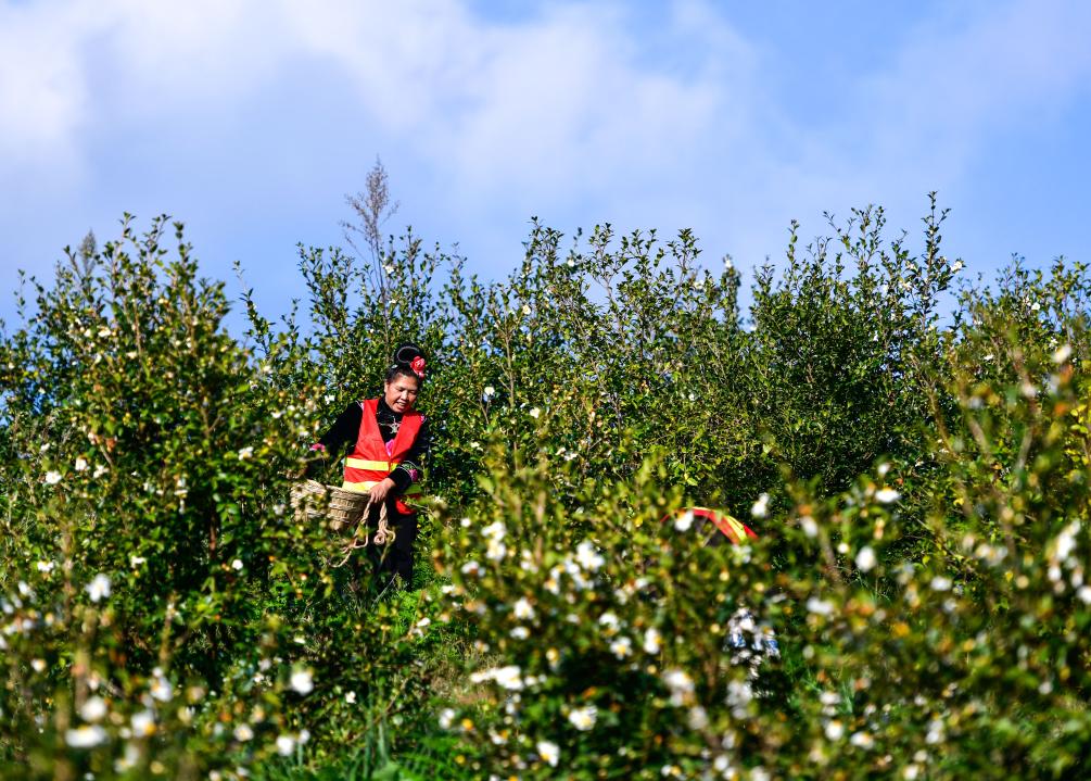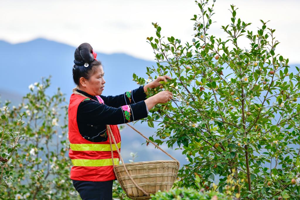 10月15日,村民在龍裏縣頤光山林油茶生態園採摘油茶果。