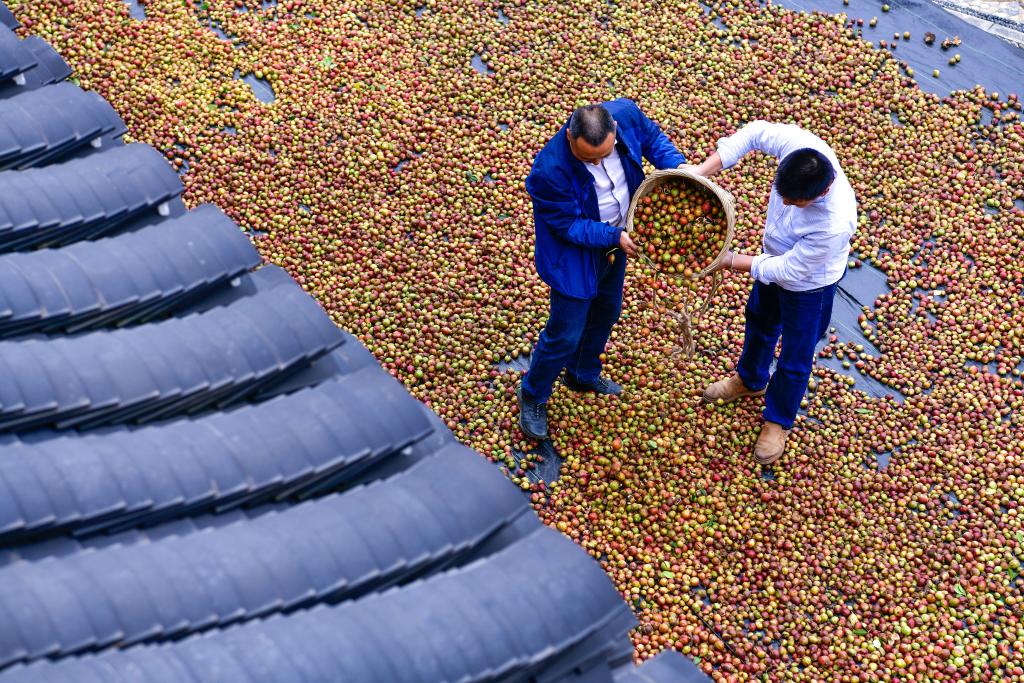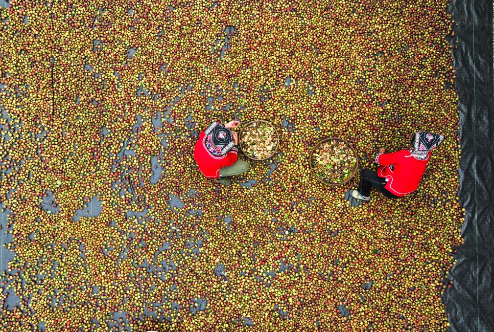 10月15日,村民在龍裏縣頤光山林油茶生態園晾曬油茶果。