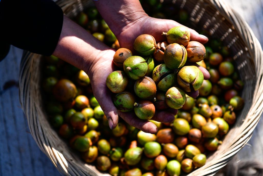 10月15日,村民在龍裏縣頤光山林油茶生態園展示新採摘的油茶果。