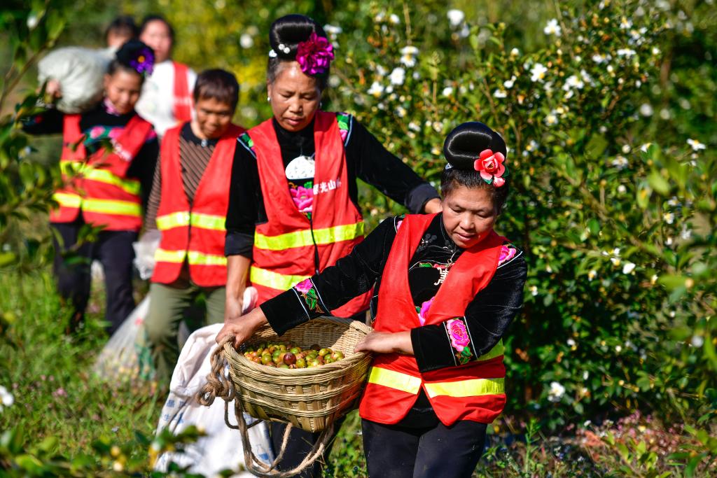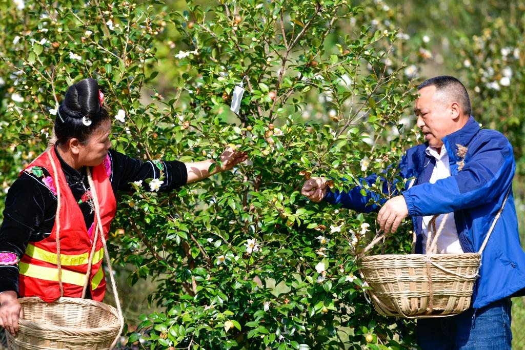 10月15日,工人(右)和村民在龍裏縣頤光山林油茶生態園採摘油茶果。