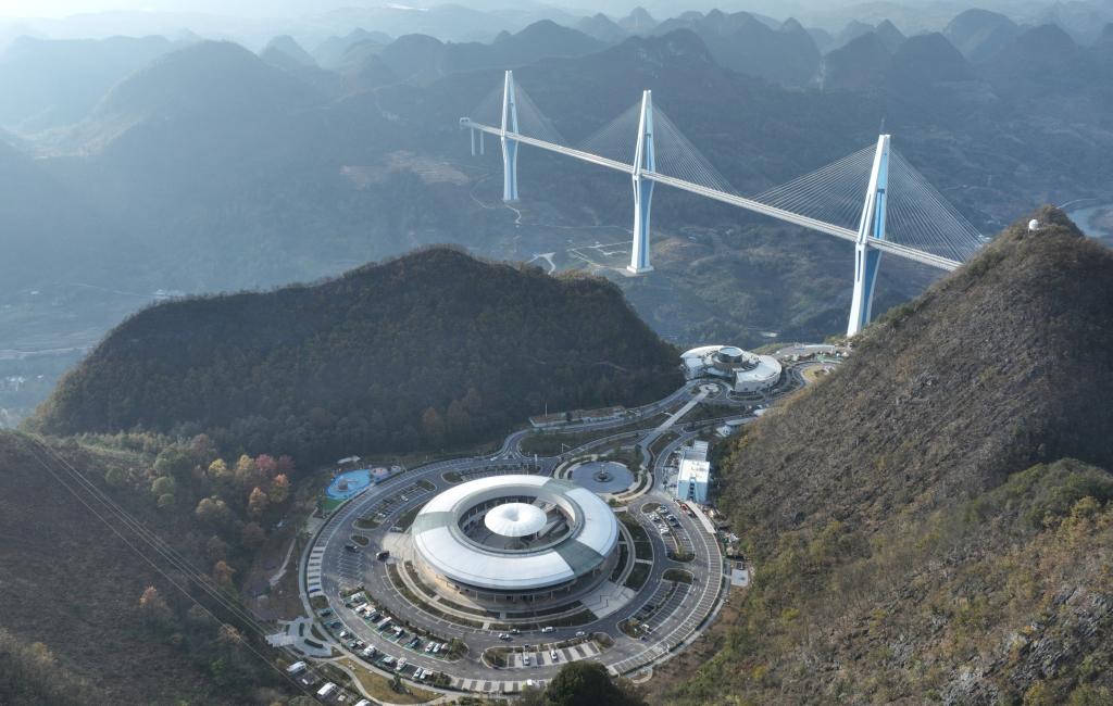 這是2023年12月6日拍攝的貴州省平塘縣“天空之橋”服務區和平塘特大橋一景。新華社記者 楊楹 攝