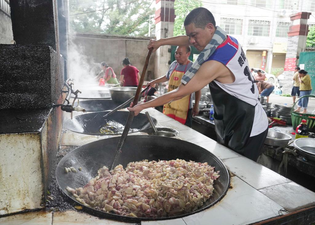 ↑6月26日,村民在忠誠鎮一處後勤伙食保障點準備飯菜。