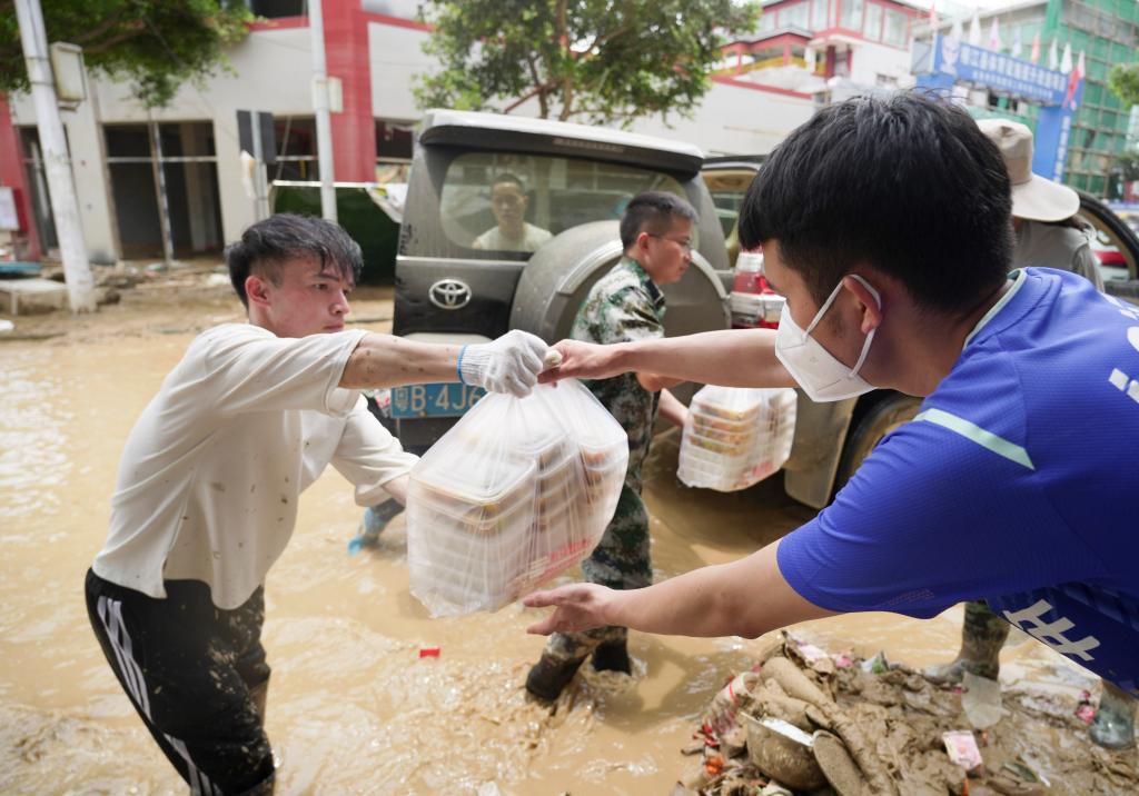↑6月27日,榕江縣城,救援人員在救援間隙吃村民送過來的盒飯。
