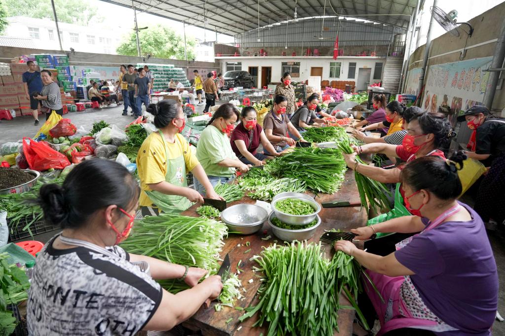 ↑6月26日,村民在忠誠鎮一處後勤伙食保障點切菜。