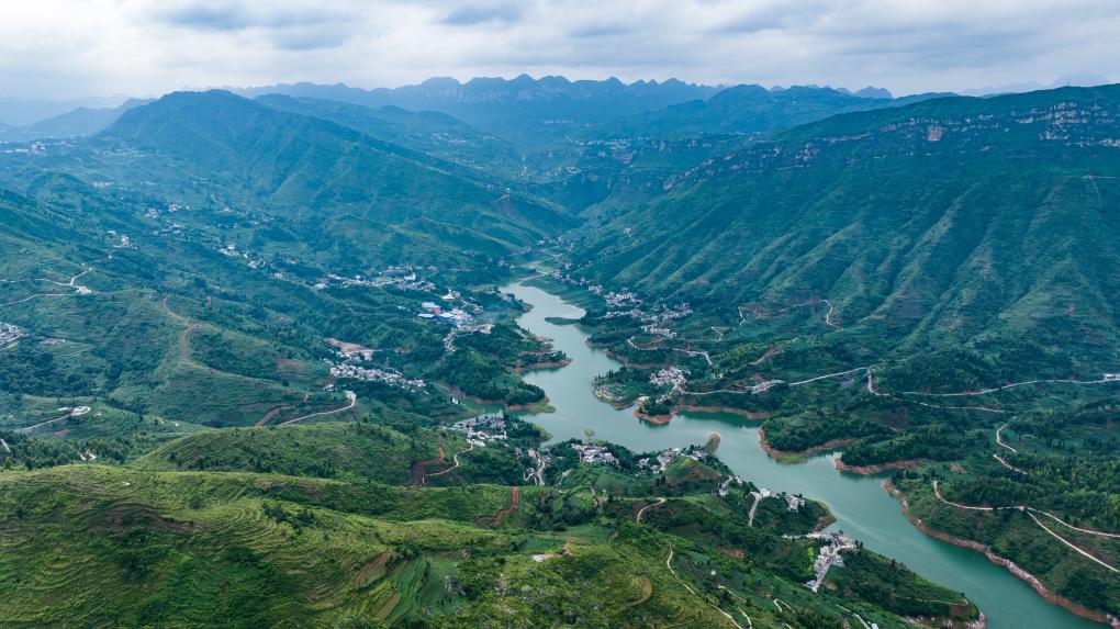 夏日時節,貴州省六盤水市六枝特區牂牁江風景名勝區草木蒼翠、江水碧藍,青山綠水與道路村莊組成一幅幅美麗畫卷。