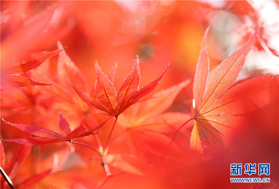 11月24日拍攝的貴州省丹寨縣萬達小鎮景區內暖陽下的楓葉。新華網發(黃曉海 攝)