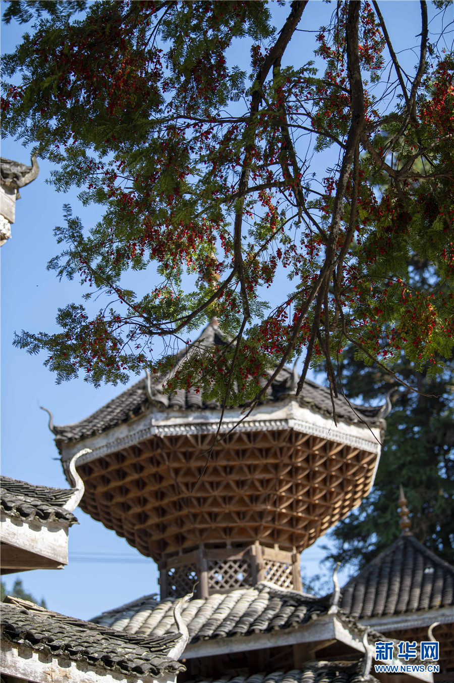 11月25日,在貴州省從江縣谷坪鄉銀下村,挂滿果實的百年野生紅豆杉與侗寨風雨橋交相輝映。新華網發(吳德軍 攝)