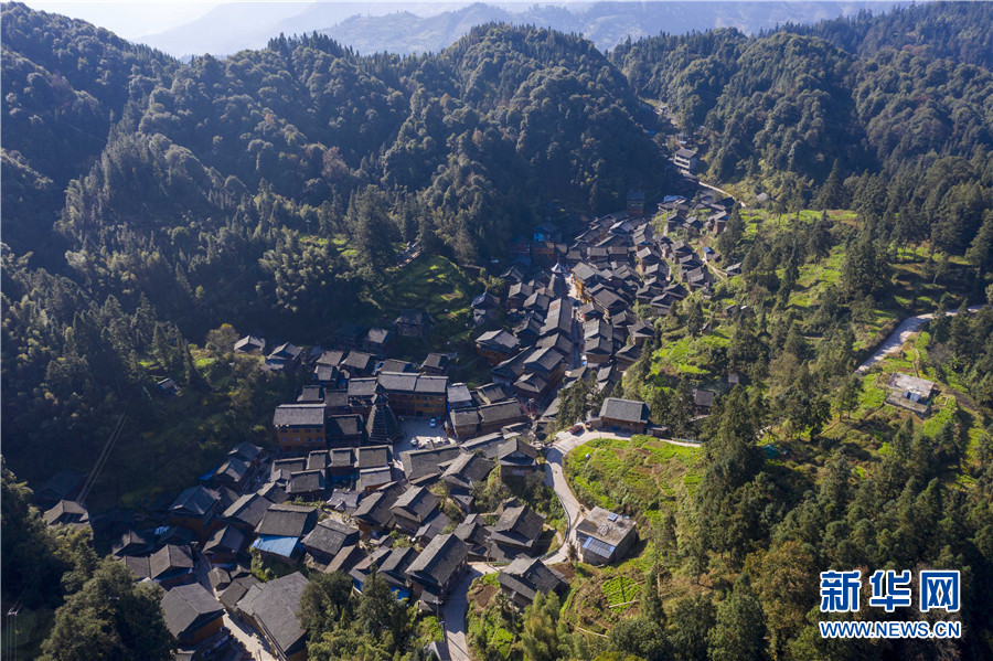 11月25日拍攝的貴州省從江縣谷坪鄉銀下村侗寨全景(無人機照片)。新華網發(吳德軍 攝)