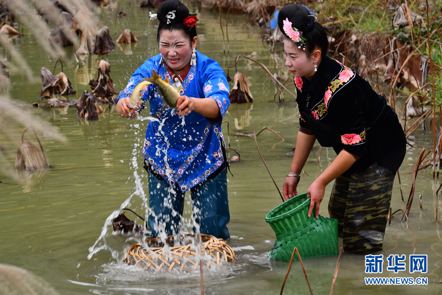 貴州省黔東南苗族侗族自治州&江縣老屯鄉報效村,村民在用傳統捉魚方式捕捉田魚(11月28日攝)。新華網發(歐陽光林 攝)