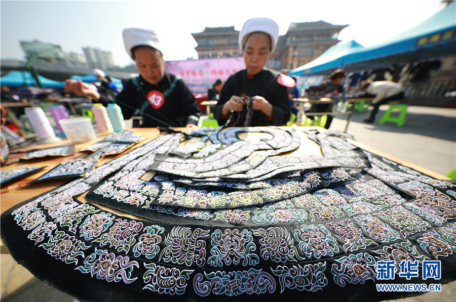 12月6日,在貴州省三都水族自治縣婦女特色手工技能比賽中,民間手工藝人在參加水族馬尾繡比賽。新華網發(黃曉海 攝)