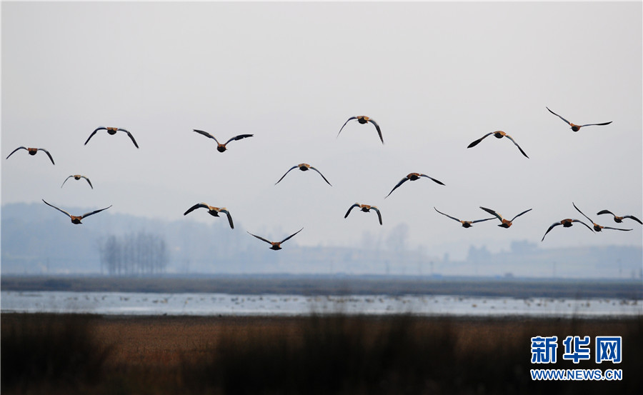 12月7日在威寧草海拍攝的飛行中的赤麻鴨。新華網 盧志佳 攝