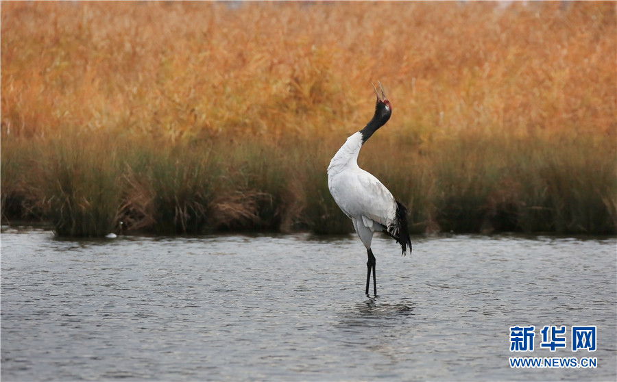11月30日在威寧草海拍攝的黑頸鶴“引吭高歌”場景。新華網發(劉廣惠 攝)