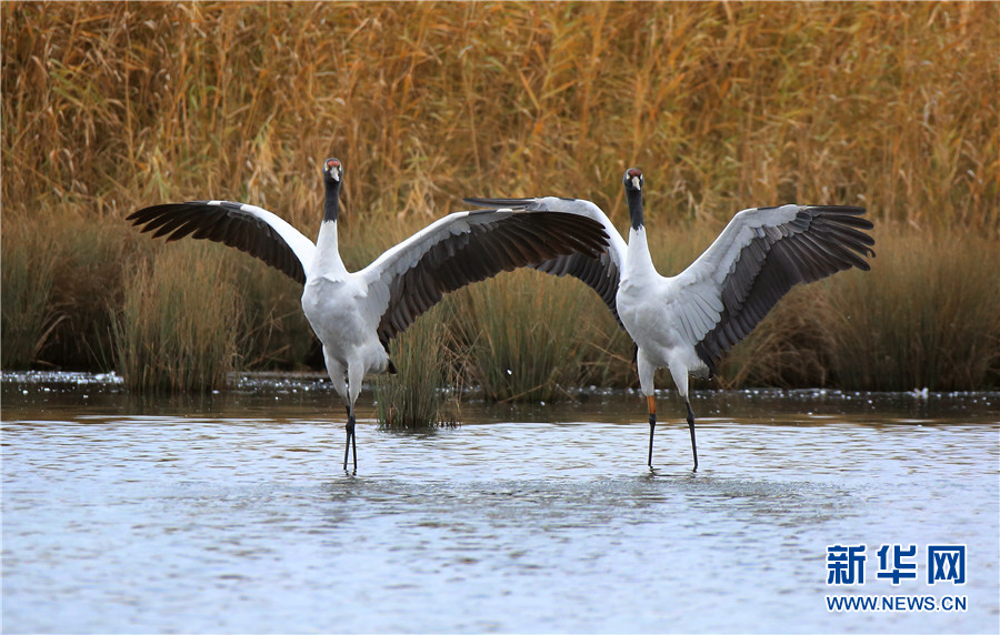 11月30日在威寧草海拍攝的黑頸鶴“水中芭蕾”場景。新華網發(劉廣惠 攝)