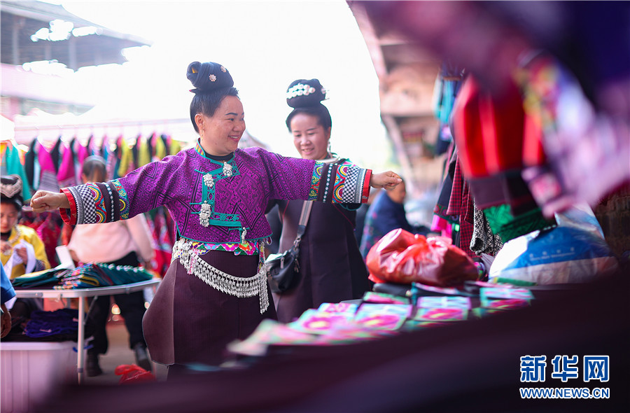12月22日,苗族婦女在貴州省丹寨縣縣城集市上試穿傳統苗族服裝。新華網發(黃曉海 攝)