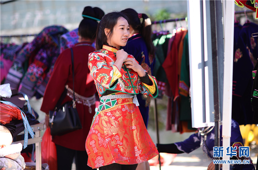 12月22日,苗族婦女在貴州省丹寨縣縣城集市上試穿傳統苗族服裝。新華網發(黃曉海 攝)
