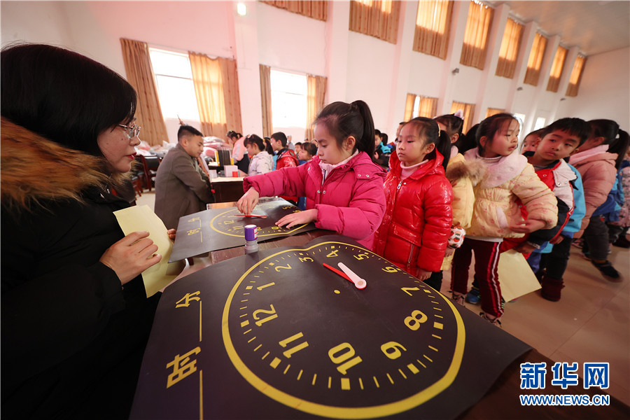 1月10日,在貴州省丹寨縣城關第一小學,一年級小學生參加認識鐘錶數字測試。新華網發(黃曉海 攝)