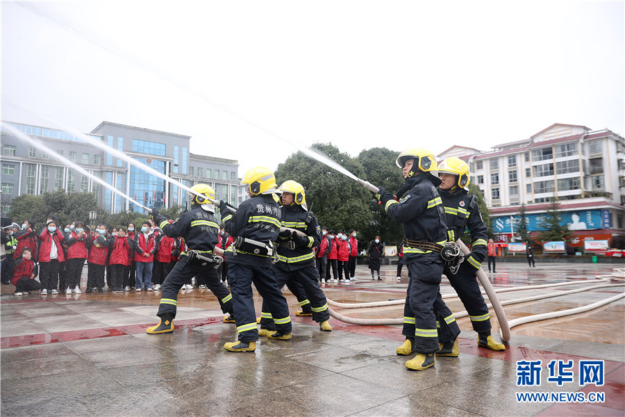 1月10日,在貴州省黔東南苗族侗族自治州丹寨縣舉行的“警營開放日”活動中,消防隊員現場展示滅火技能。新華網發(黃曉海 攝)